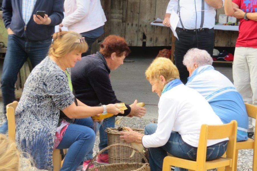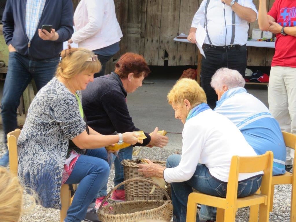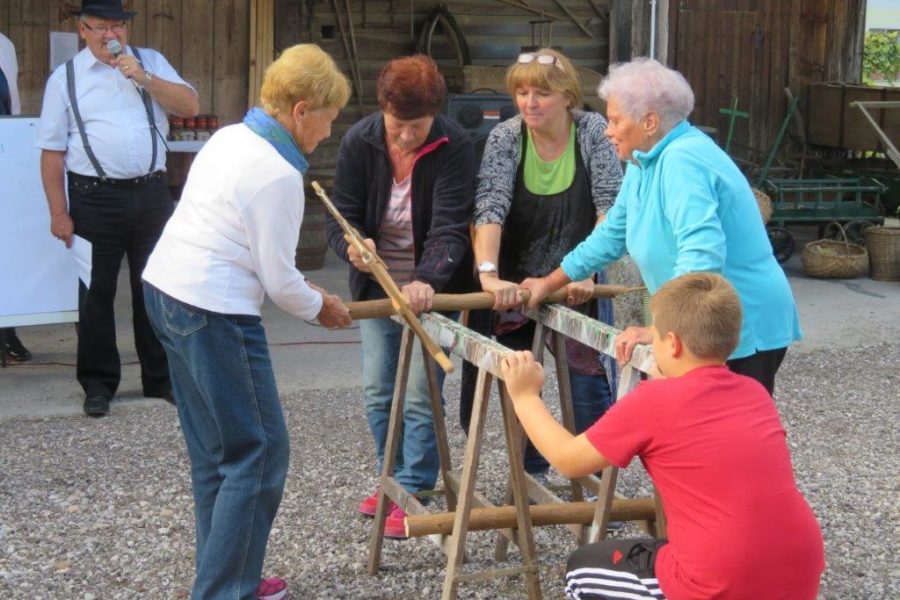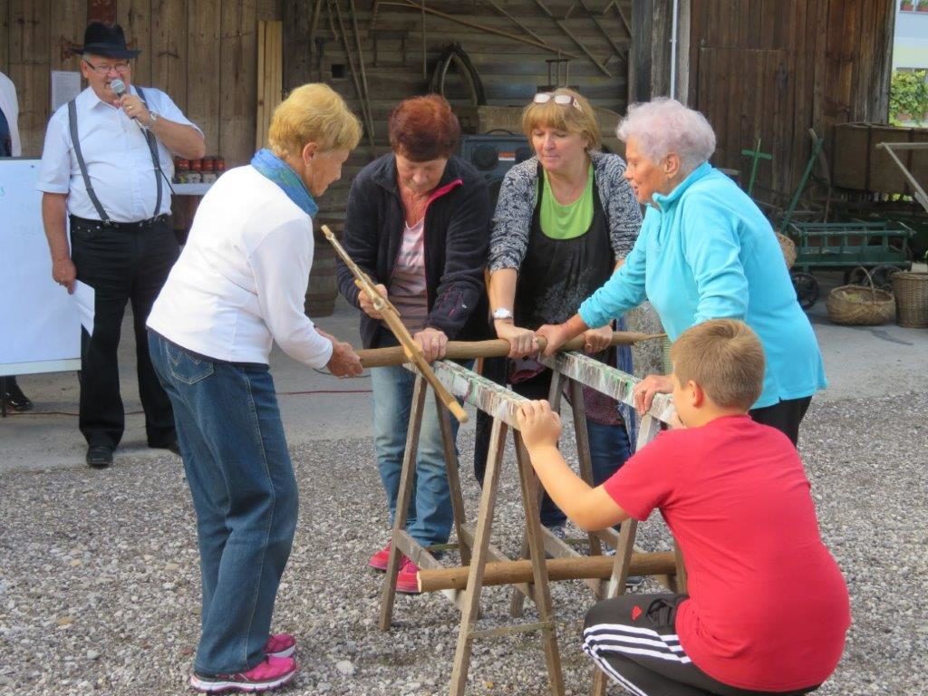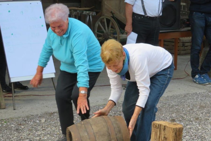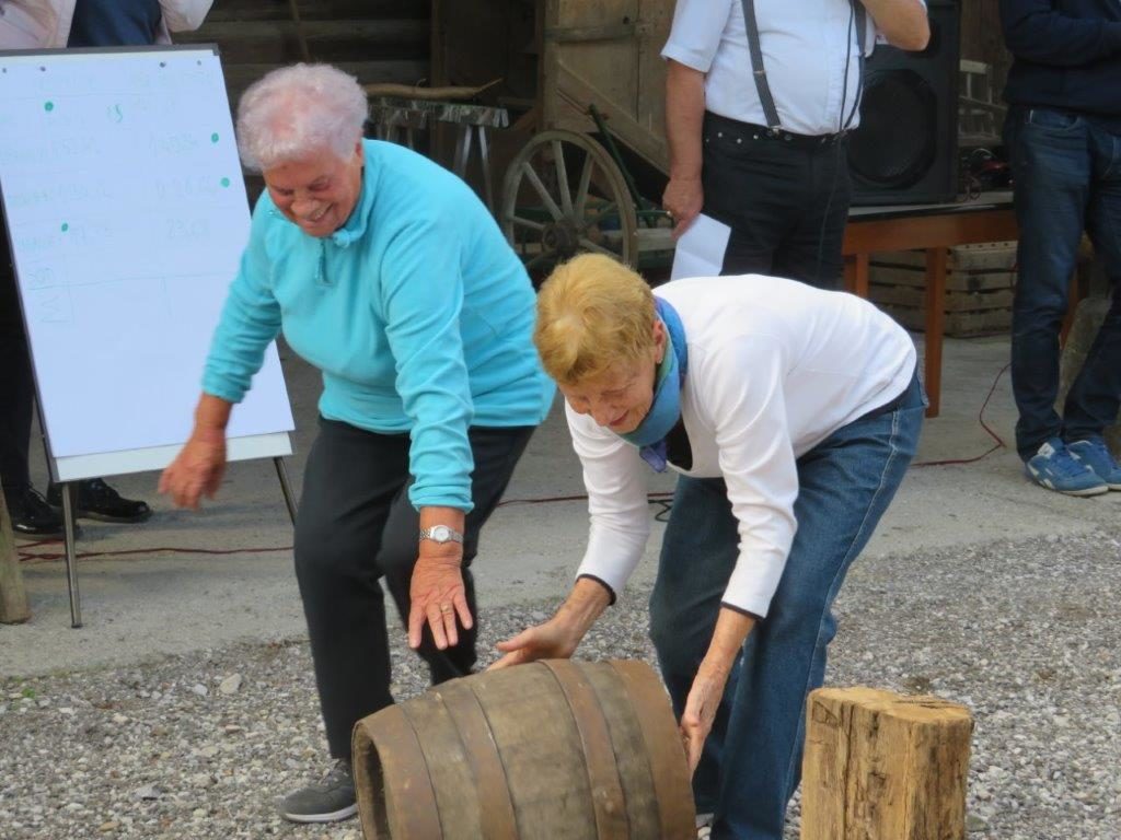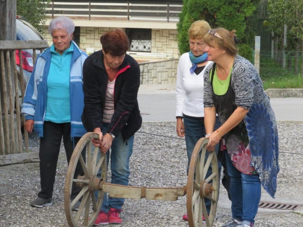 Ker pa red mora biti, so organizatorji napovedali začetek tekmovanja. Kar štiri ekipe smo se preizkusile v spretnostih. Najprej so tekmovali mlajši, nato starejši otroci. In prišel je tudi naš trenutek. Šment sploh ni tako lahko vreči škorenj čez ramo v škaf, kaj šele kotaliti v paru kolesi na povezani z osjo, ste že kdaj ličkali svežo koruzo, to še gre, rofkati to je druga zgodba. K sreči smo imele Zofi, ki je vajena poprijeti in z močno roko je reševala vse nas. Tudi pri žaganju s staro ročno mizarsko žago je bila nedosgljiva ekipi od Hiše čez cesto. Izenačen rezultat je napovedoval še en spopad. Zakaj pa ne, saj smo ravno dobro ogrele. Oj joj, kotalile smo sod. Preprosto boste rekli. Kje pa ! Ne gre v smer kamor hočeš, strašno neubogljivo bi se sprehajal po dvorišču. No vseeno smo ga prikotalile do ciljne črte.